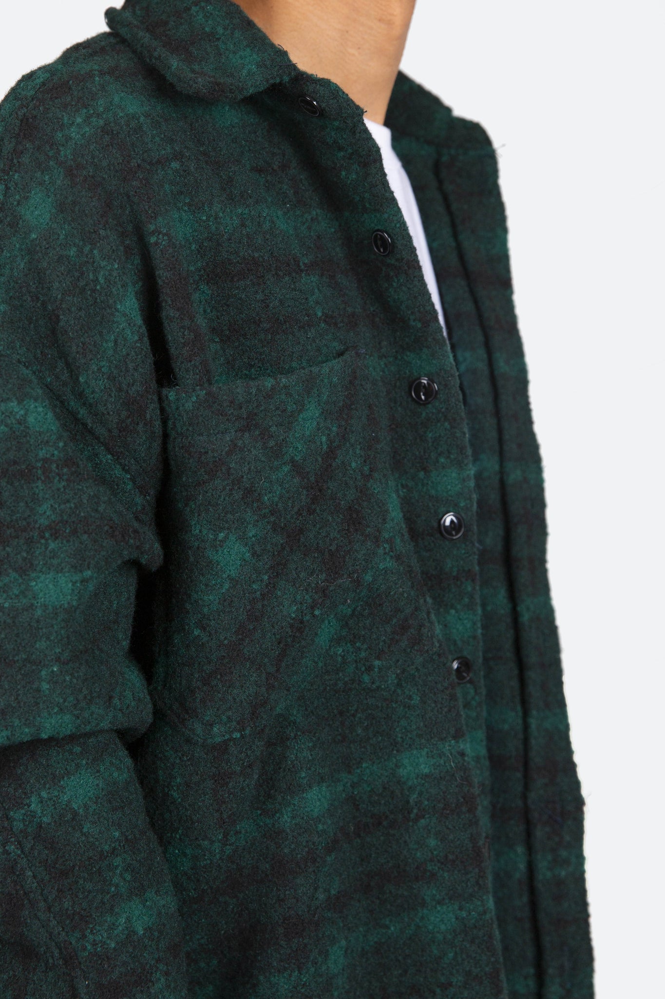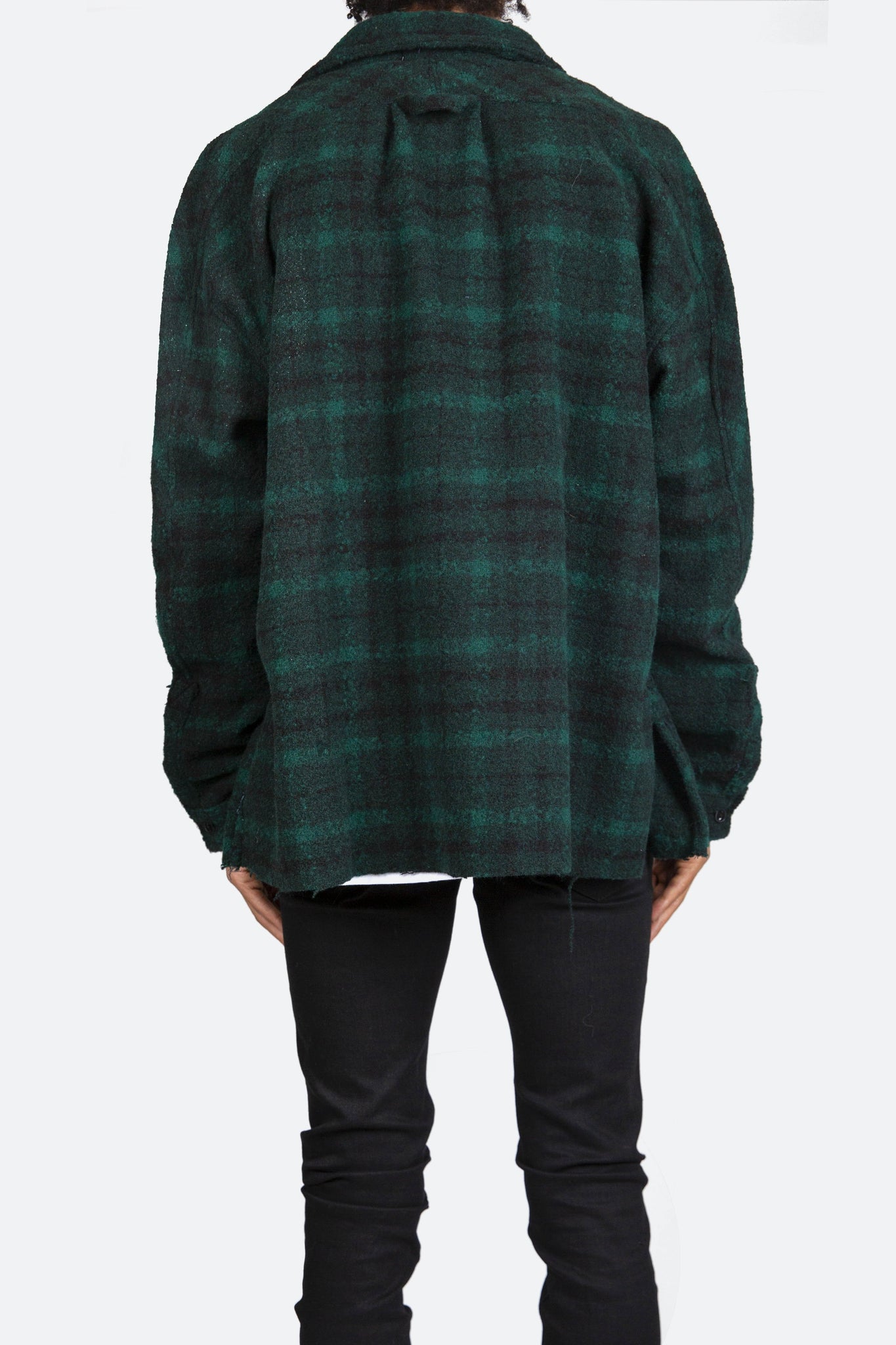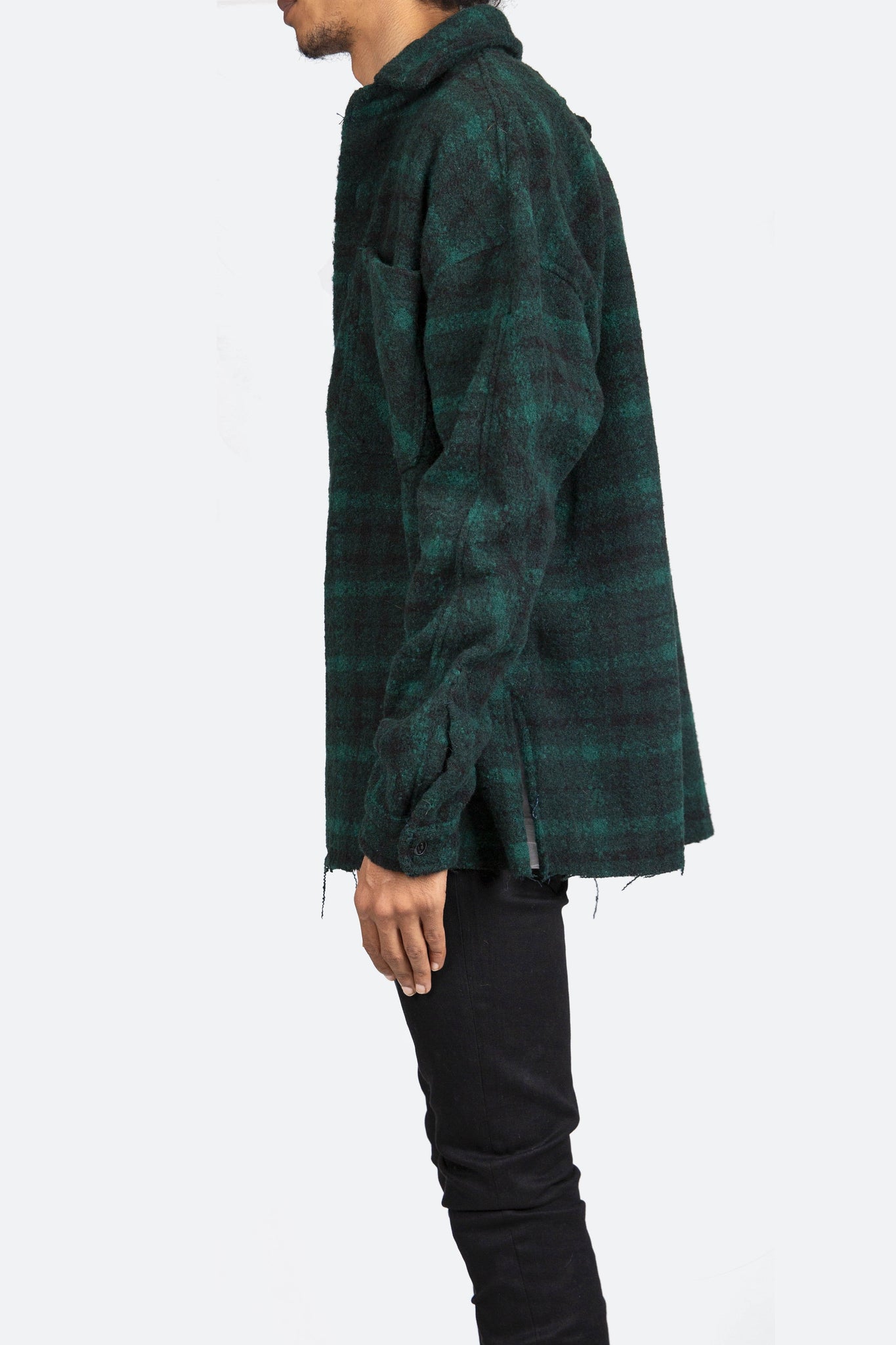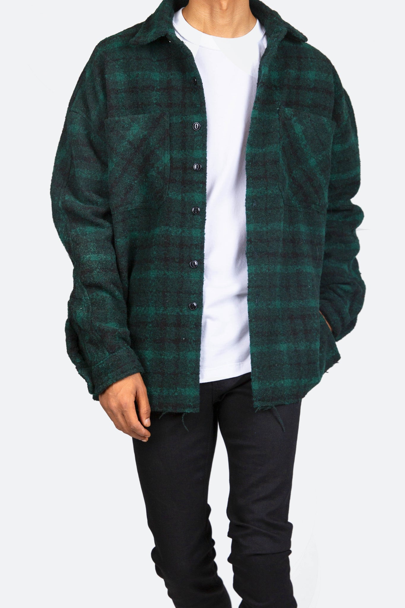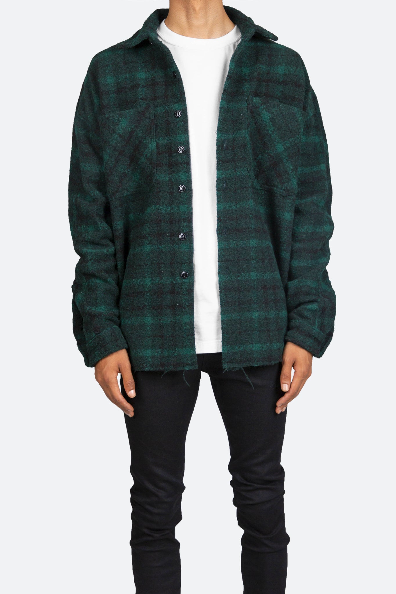 the Loose Woven Flannel Shirt is designed with an oversized fit, a raw hemline, pleats at the wrist with an adjustable button closure, and finished in a loose weave custom polyester plaid fabric.