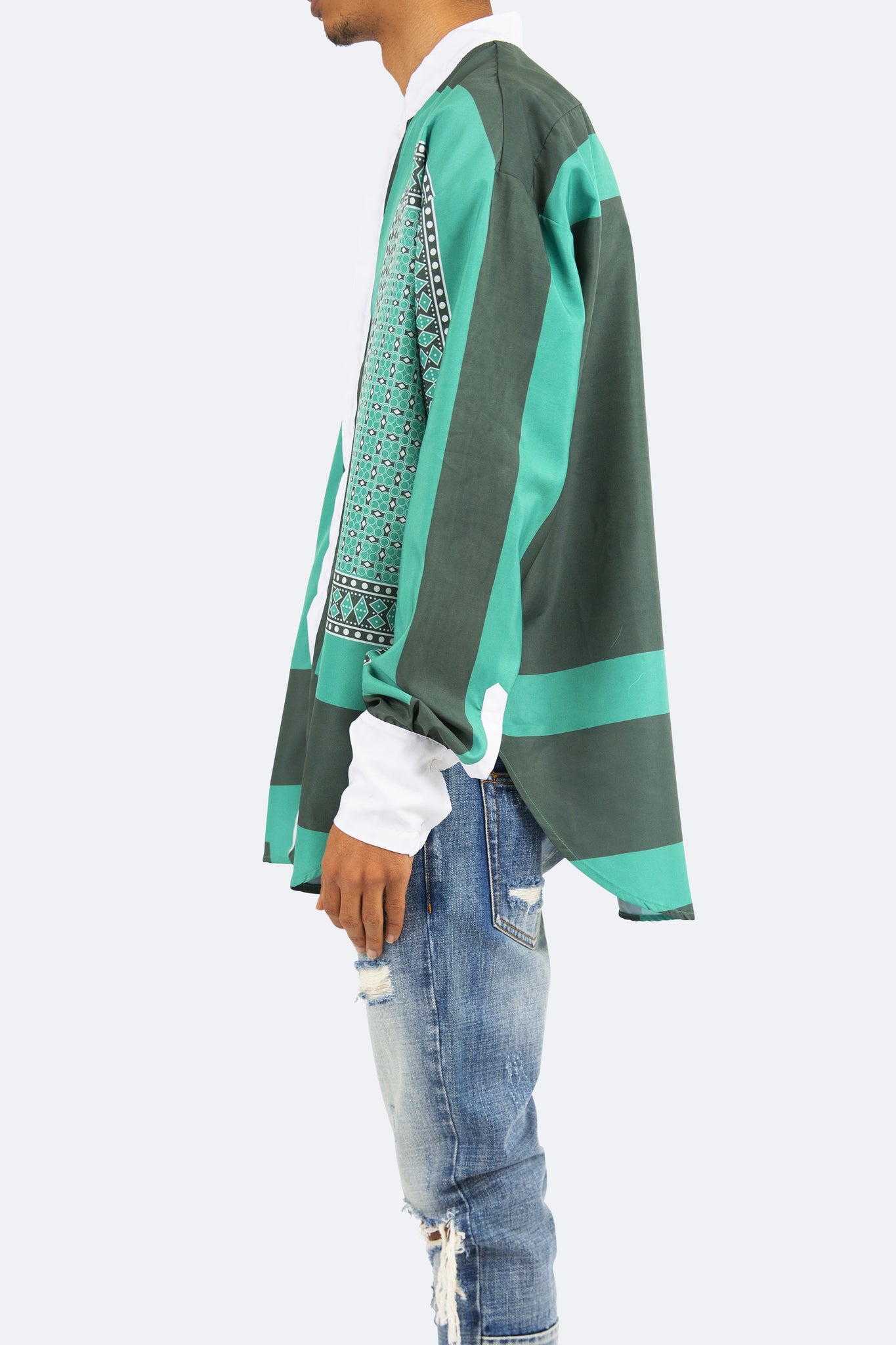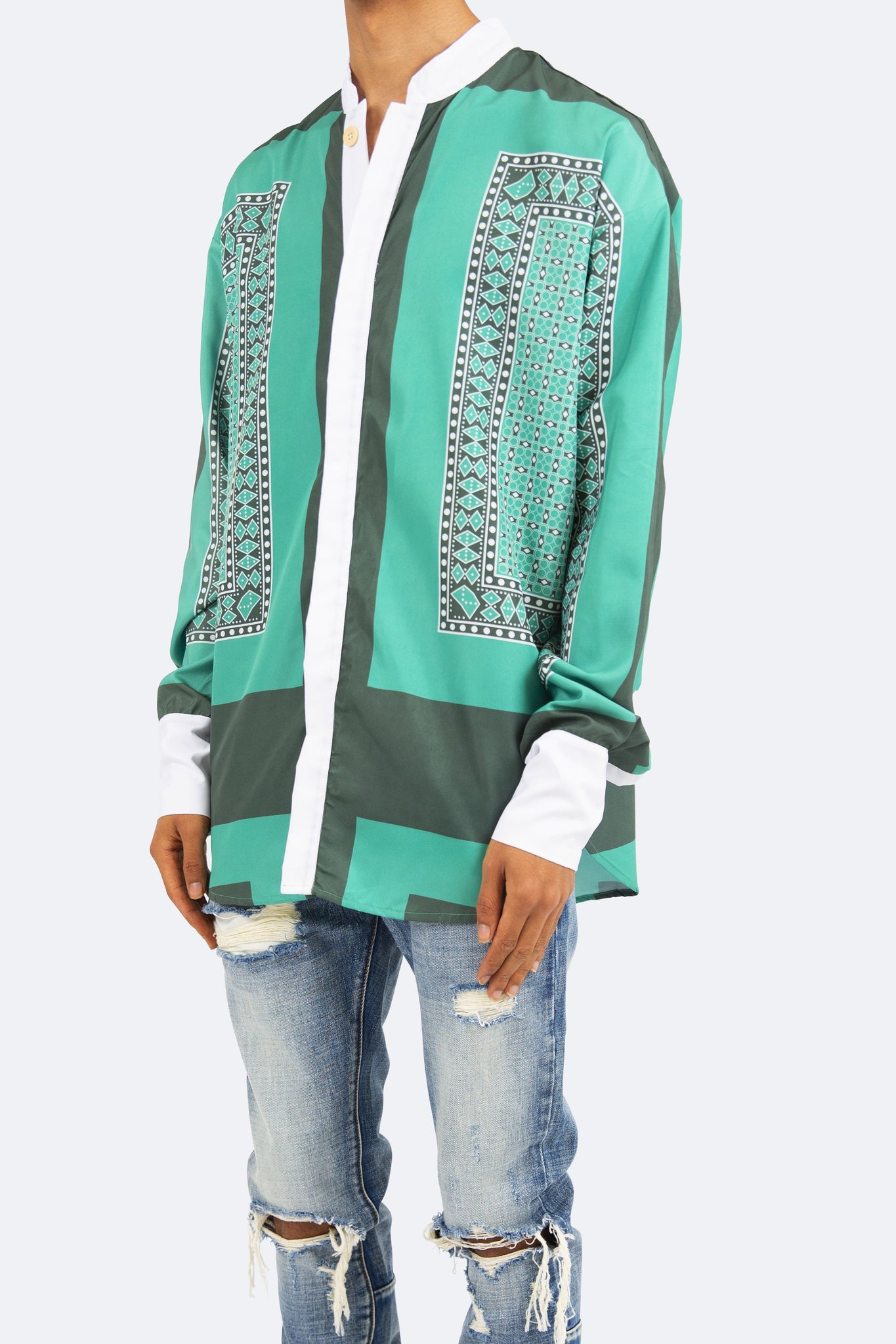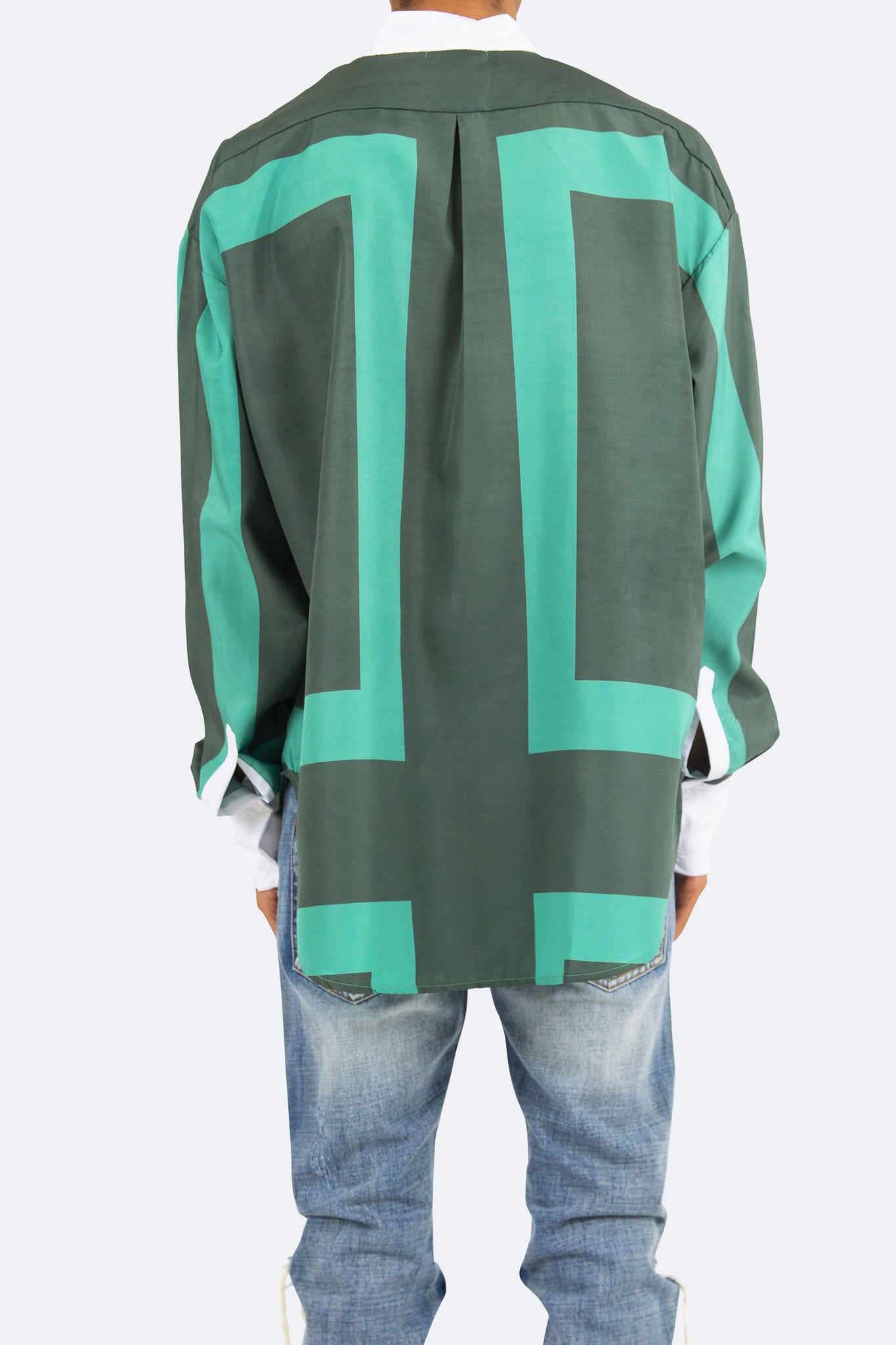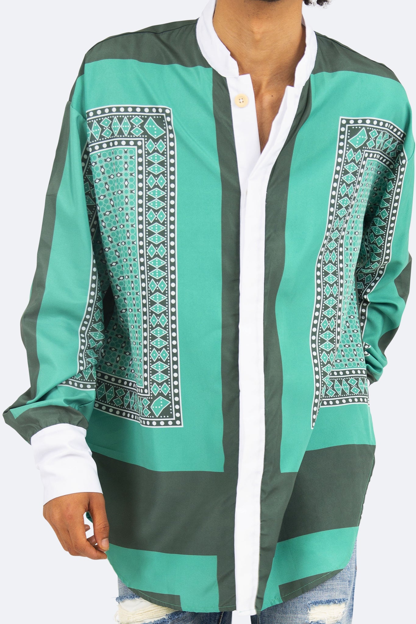 the Mandarin Collar Shirt is made from a lightweight viscose with a sublimated geometric print throughout. The relaxed-fit shirt features a camp collar and contrasting placket, collar, and cuff.