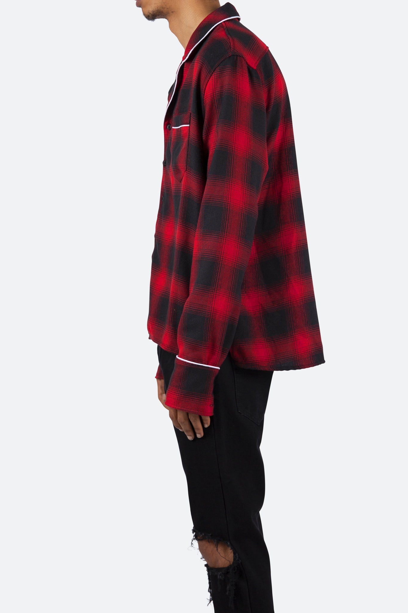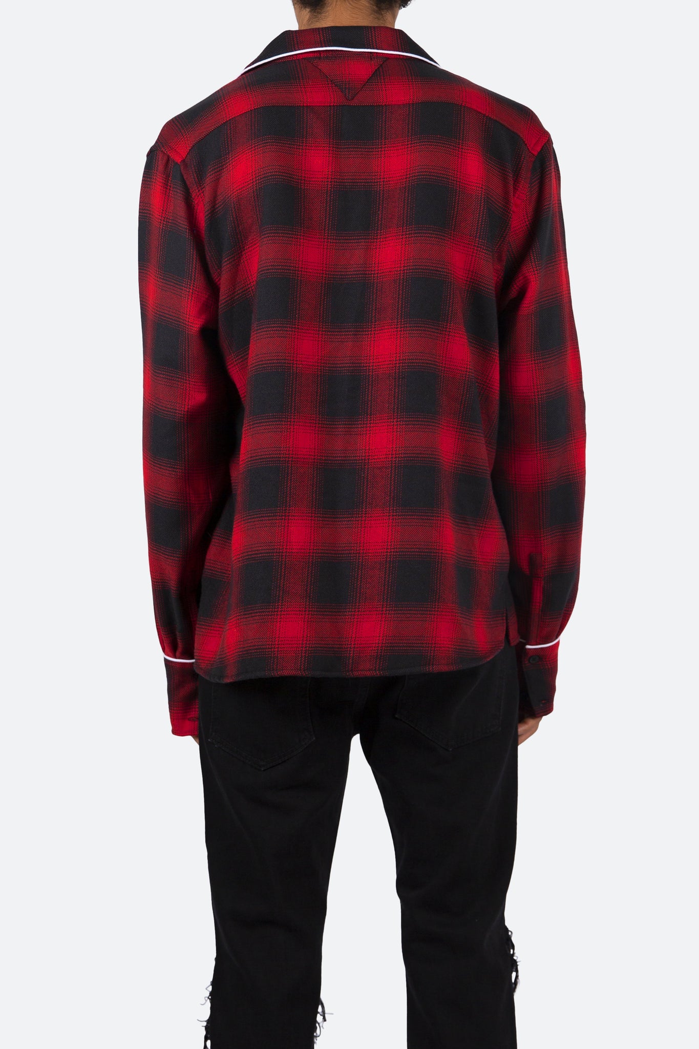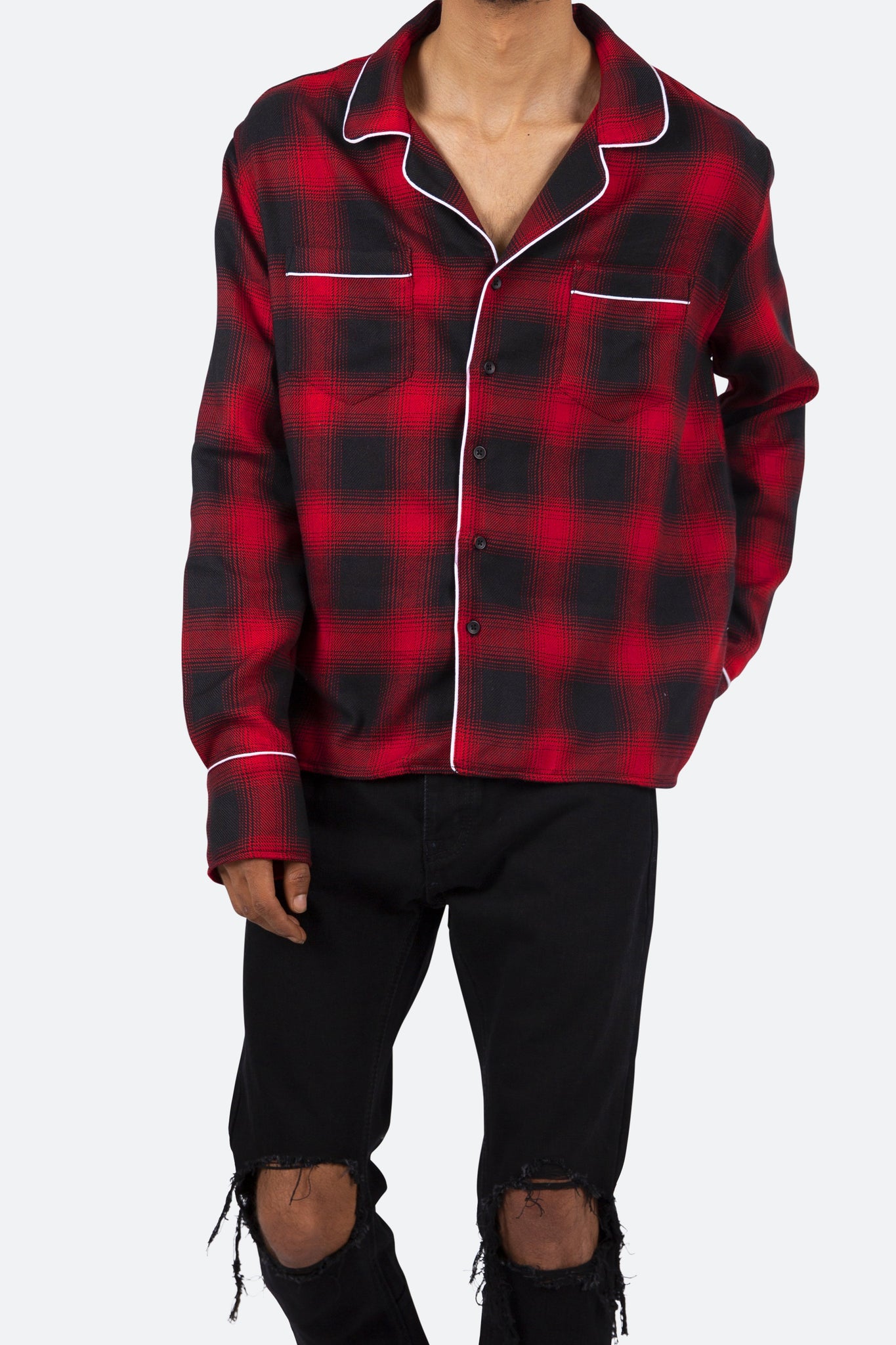 the Pajama Flannel Shirt is designed with a relaxed fit, a flat hemline, contrasting piping at seam edges, and finished in a custom woven cotton fabric.