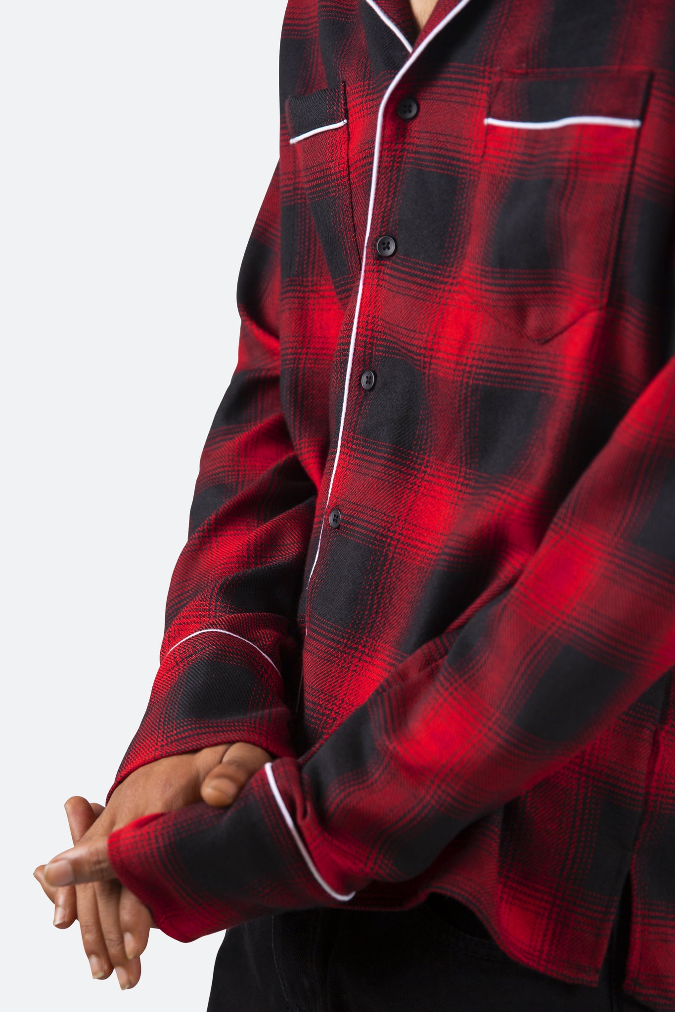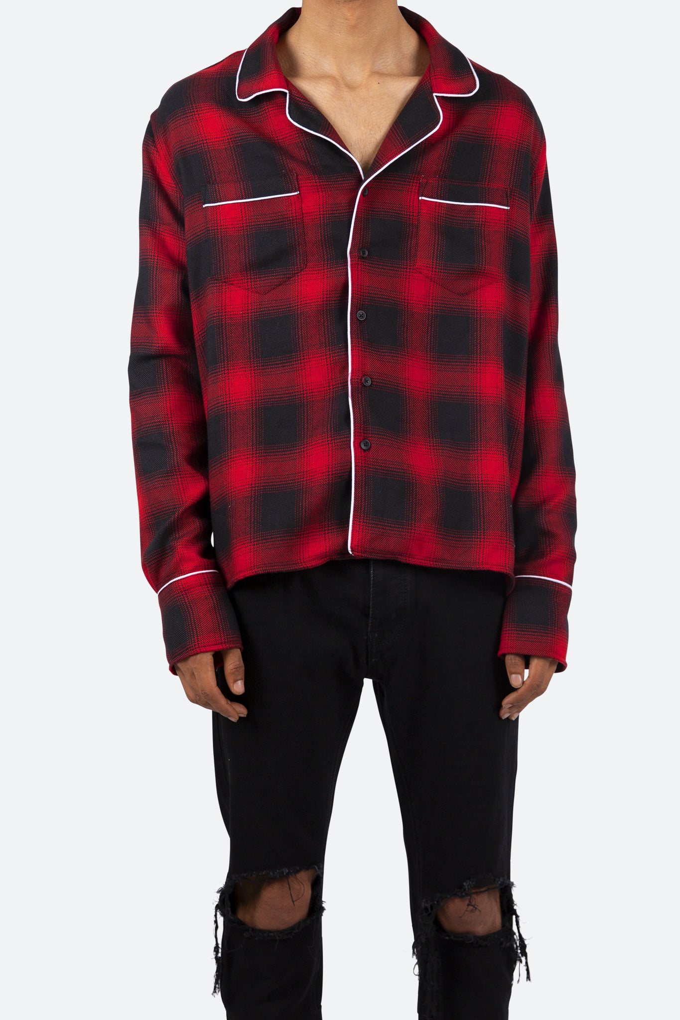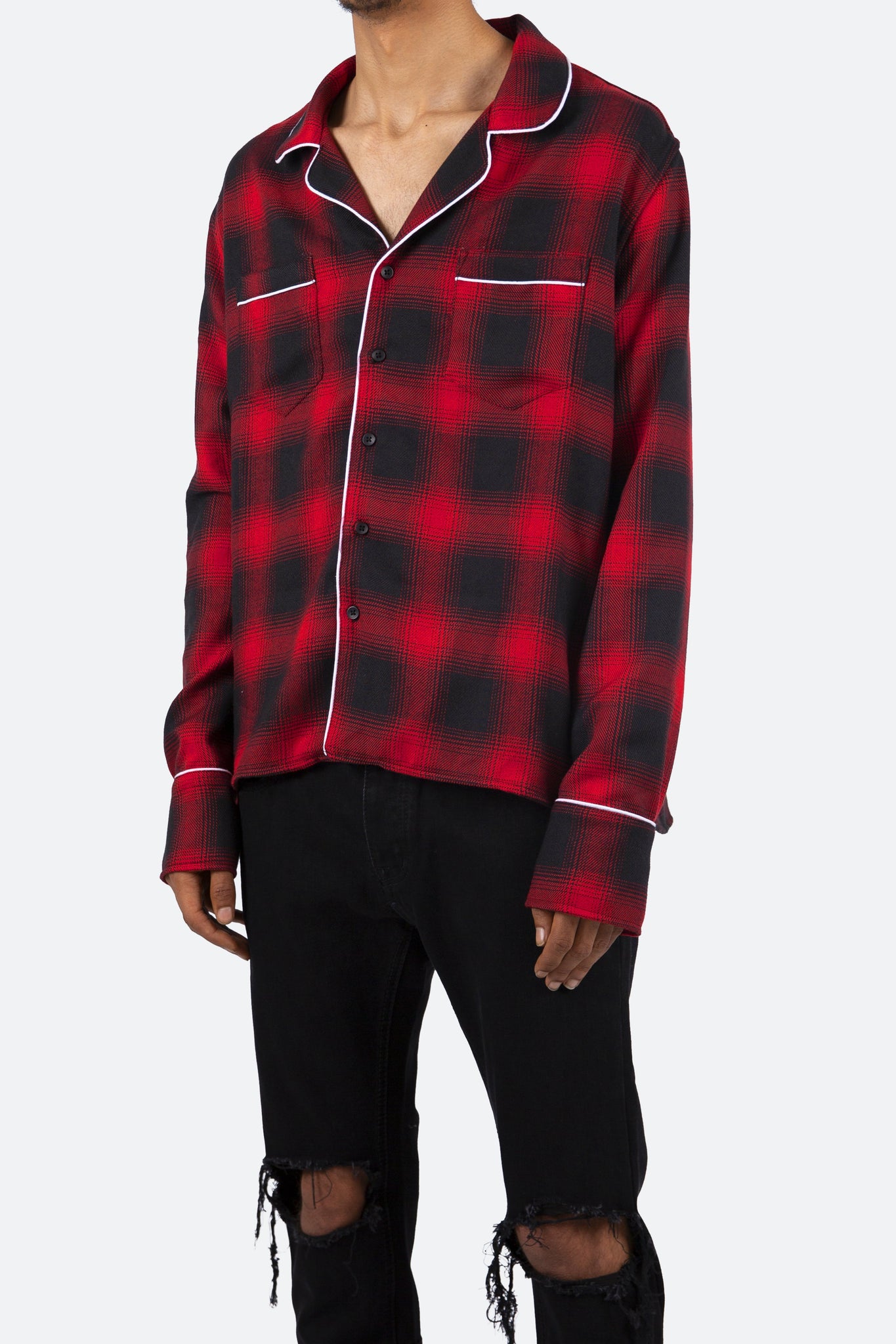 the Pajama Flannel Shirt is designed with a relaxed fit, a flat hemline, contrasting piping at seam edges, and finished in a custom woven cotton fabric.