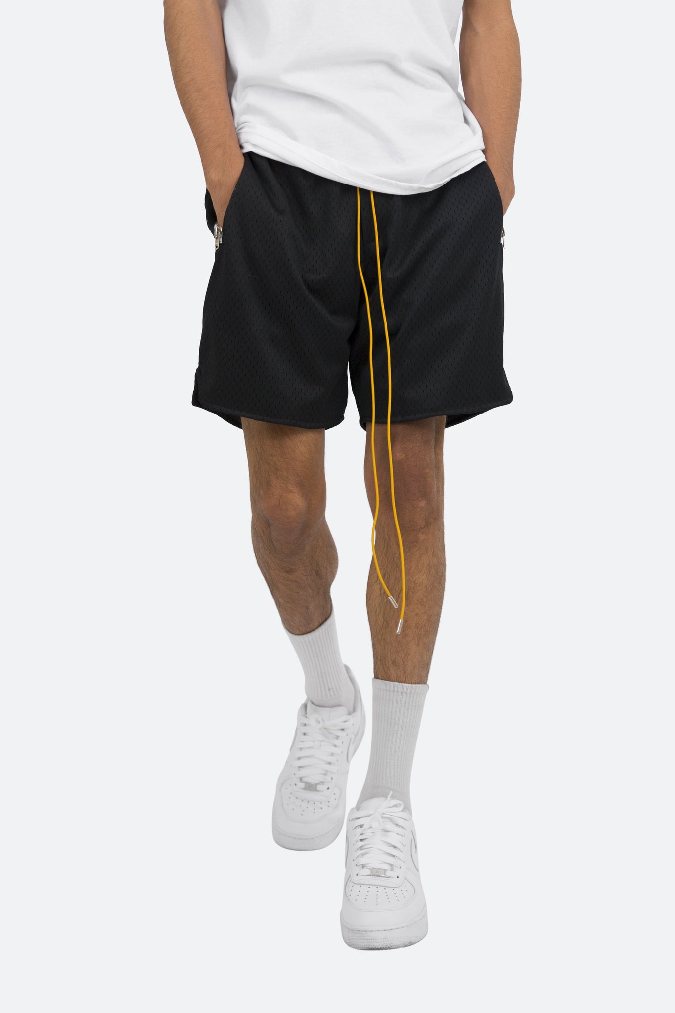 the Basic Mesh Shorts are constructed with a custom-knit mesh fabric in a relaxed fit. The short features striped ribbing at the waist, zipper pockets on the front, and a contrasting elastic drawstring.