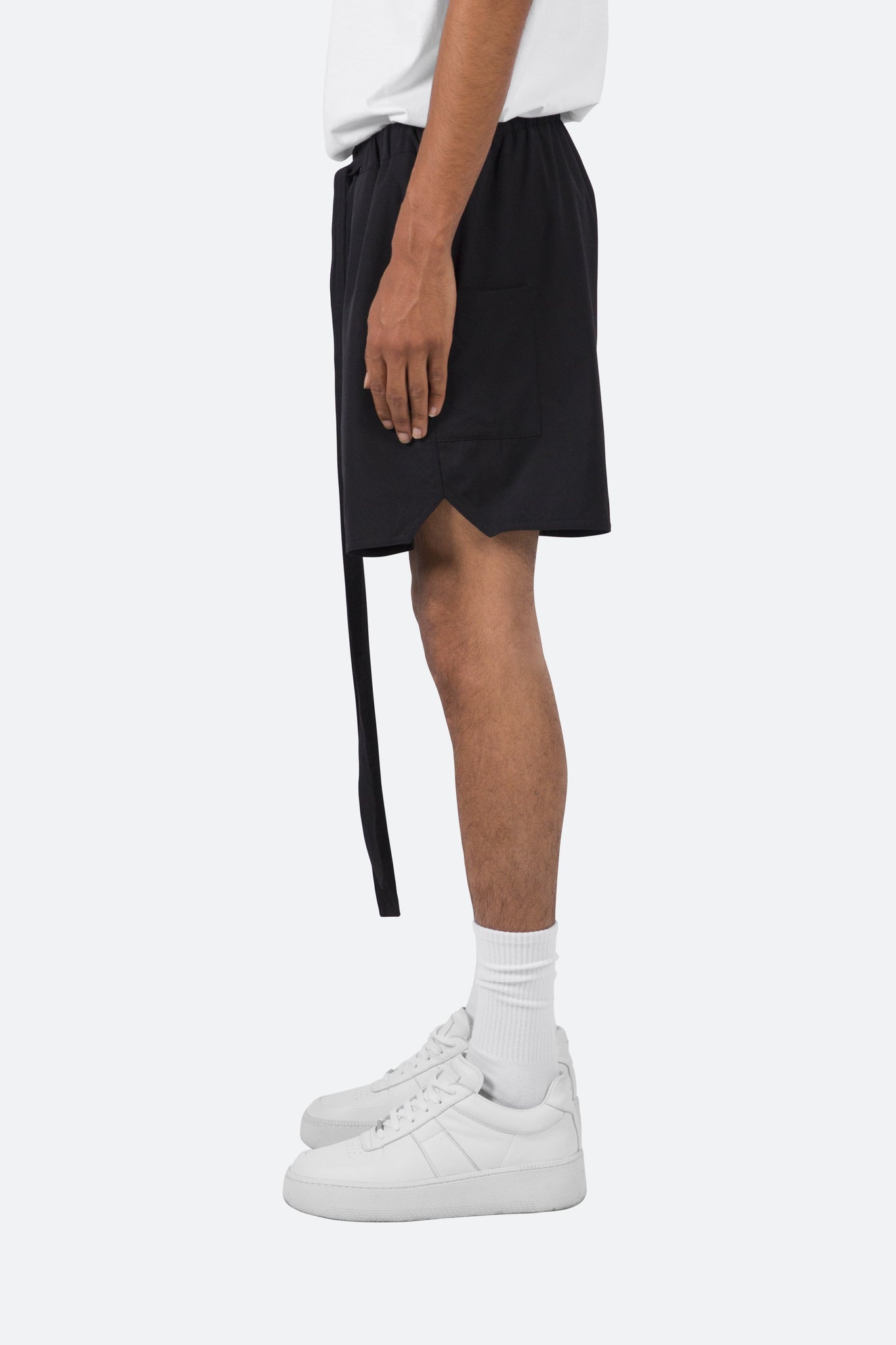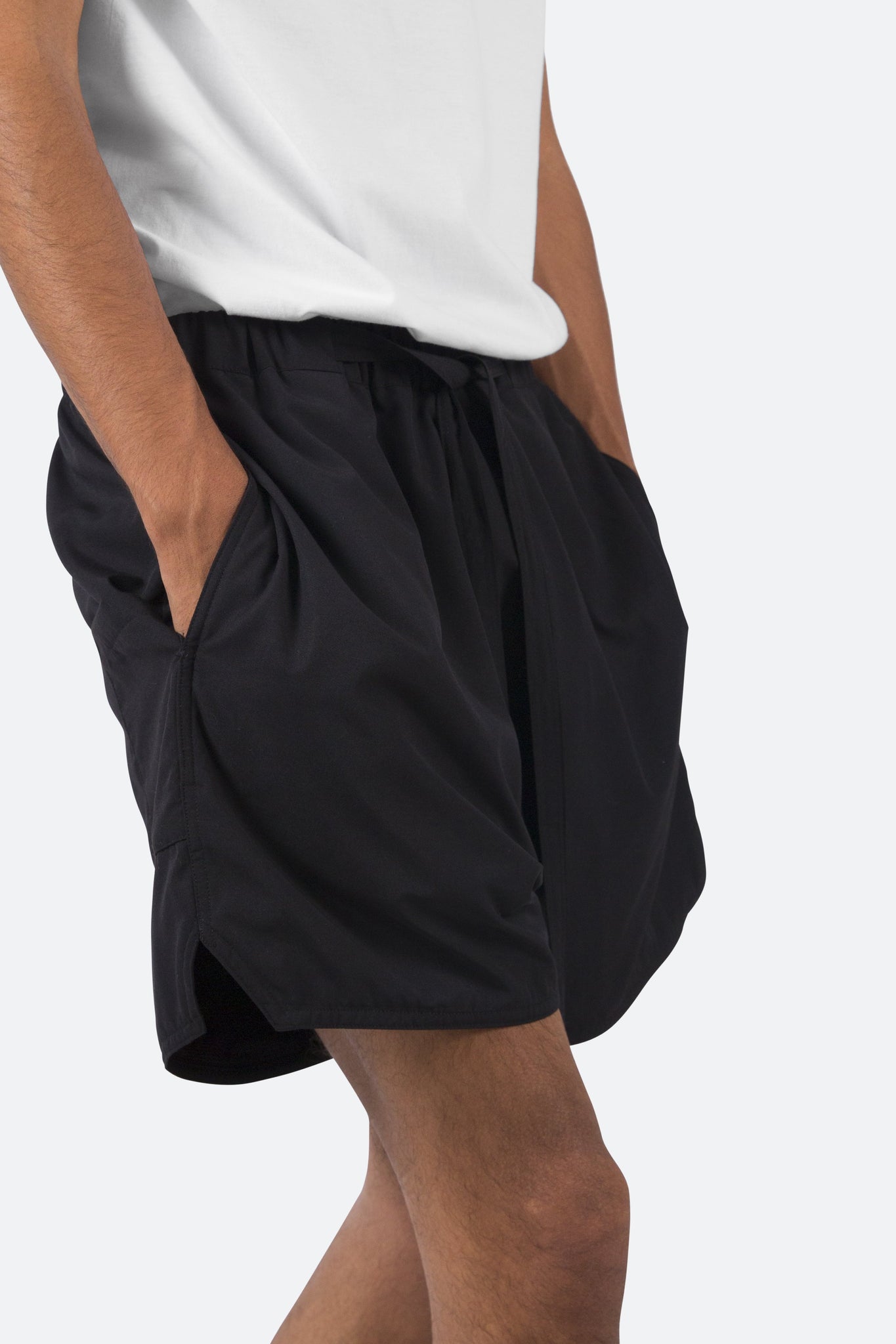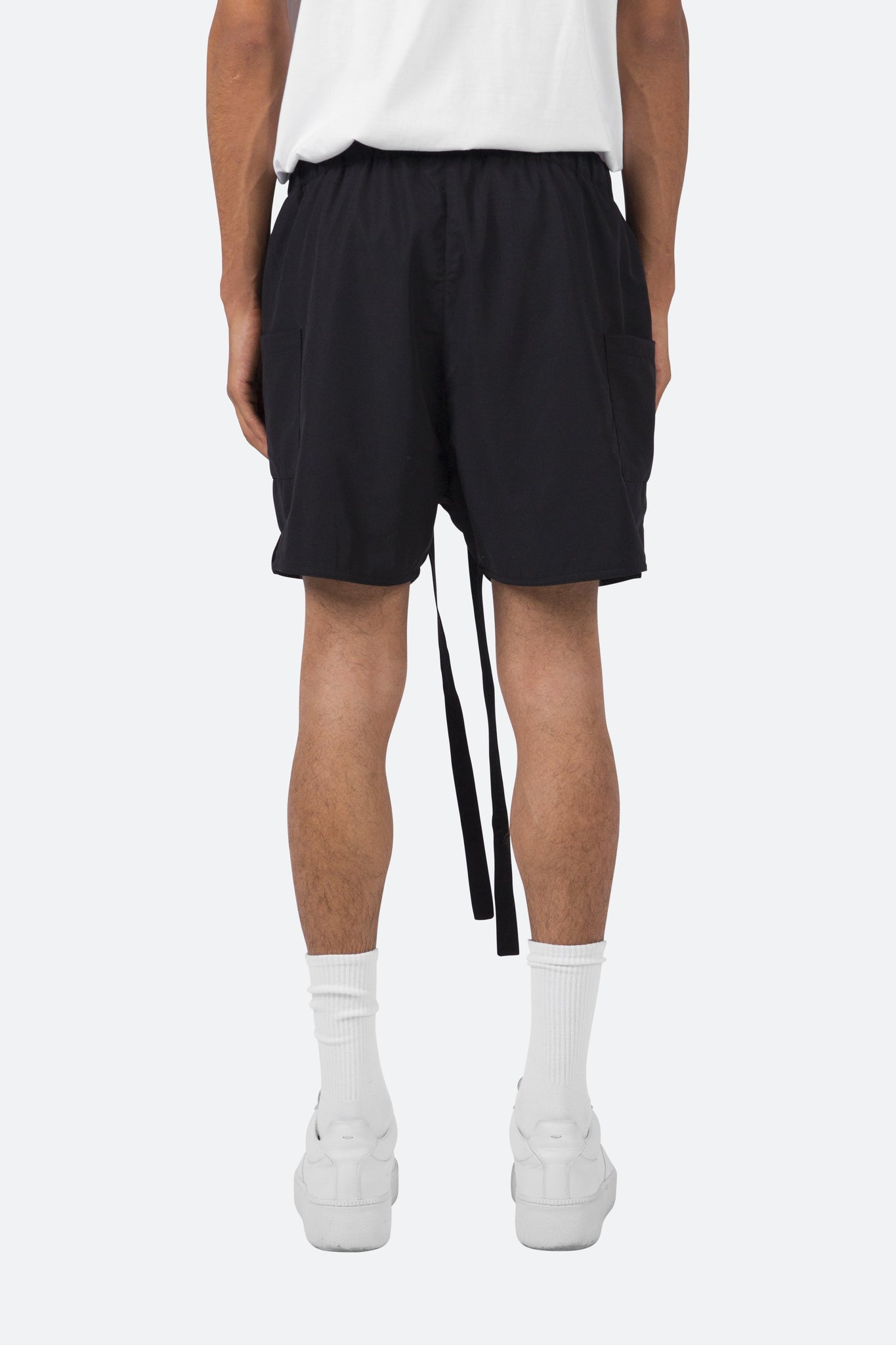the Nylon Carpenter Shorts are designed in a twill fabric that features welt pockets in the side seams and additional pockets on the back and is finished with a built in extended belt constructed from self fabric.