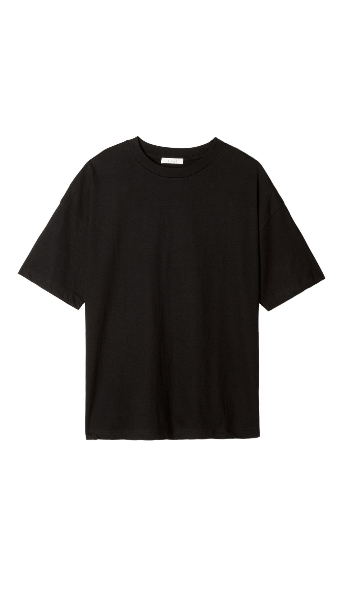 this tee features a flat hem line and an extended shoulder seam for an oversized, dropped shoulder fit.
