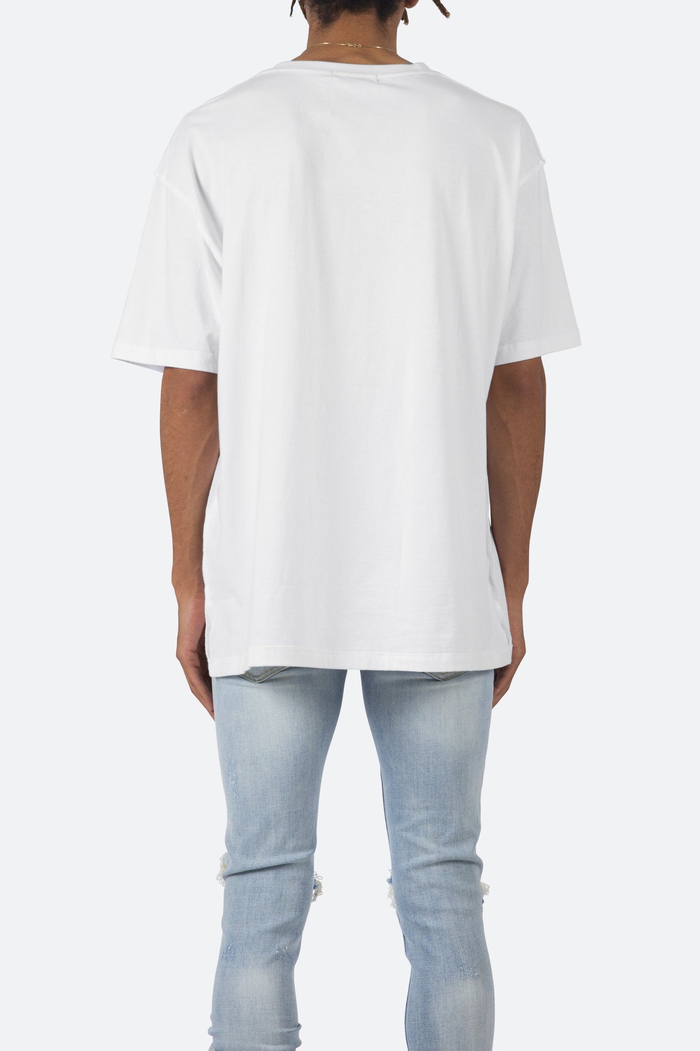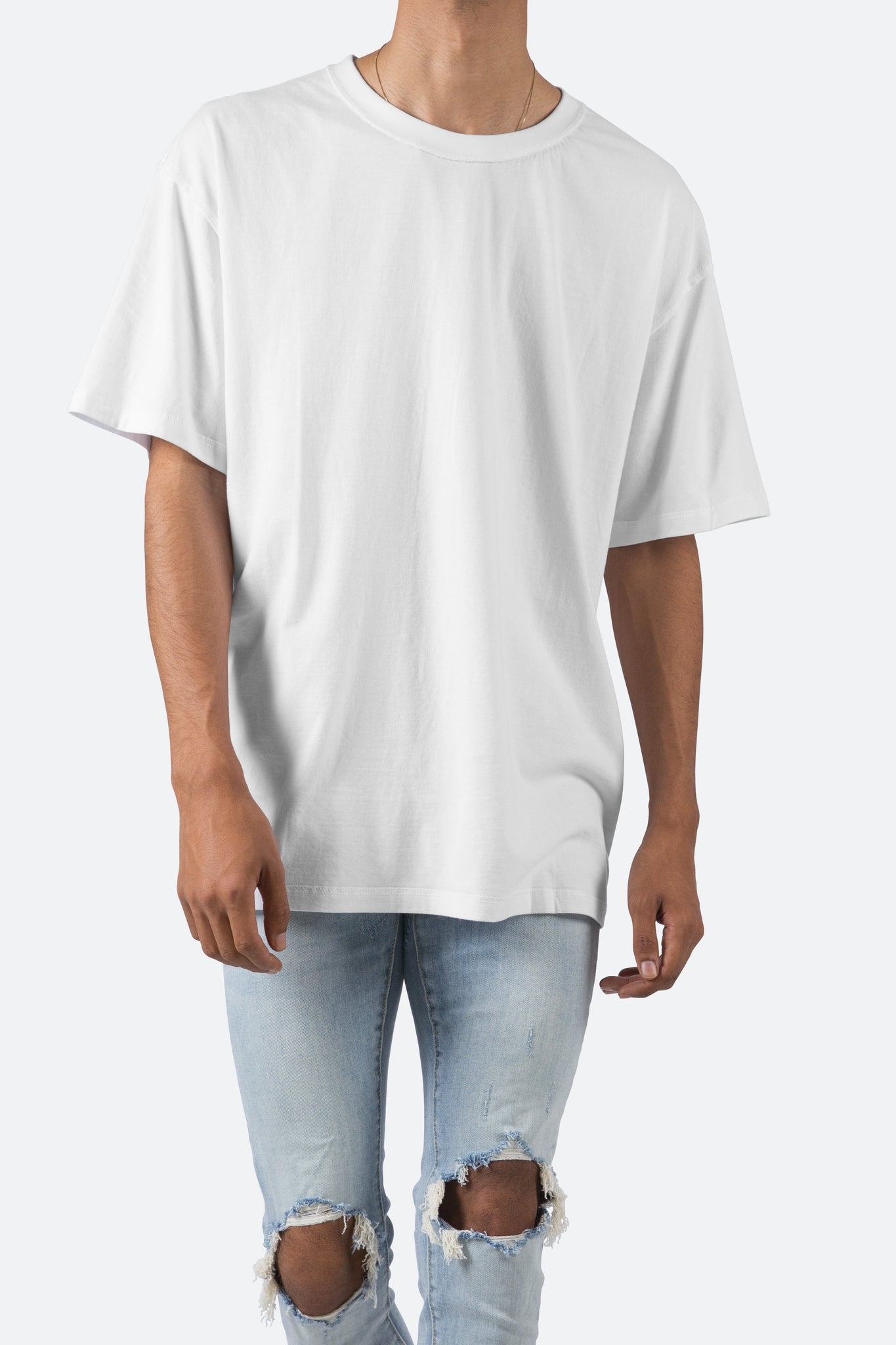 the inside out tee features a flat hem line and an extended shoulder seam for an oversized, dropped shoulder fit, and constructed inside out to expose seams and the hem.
