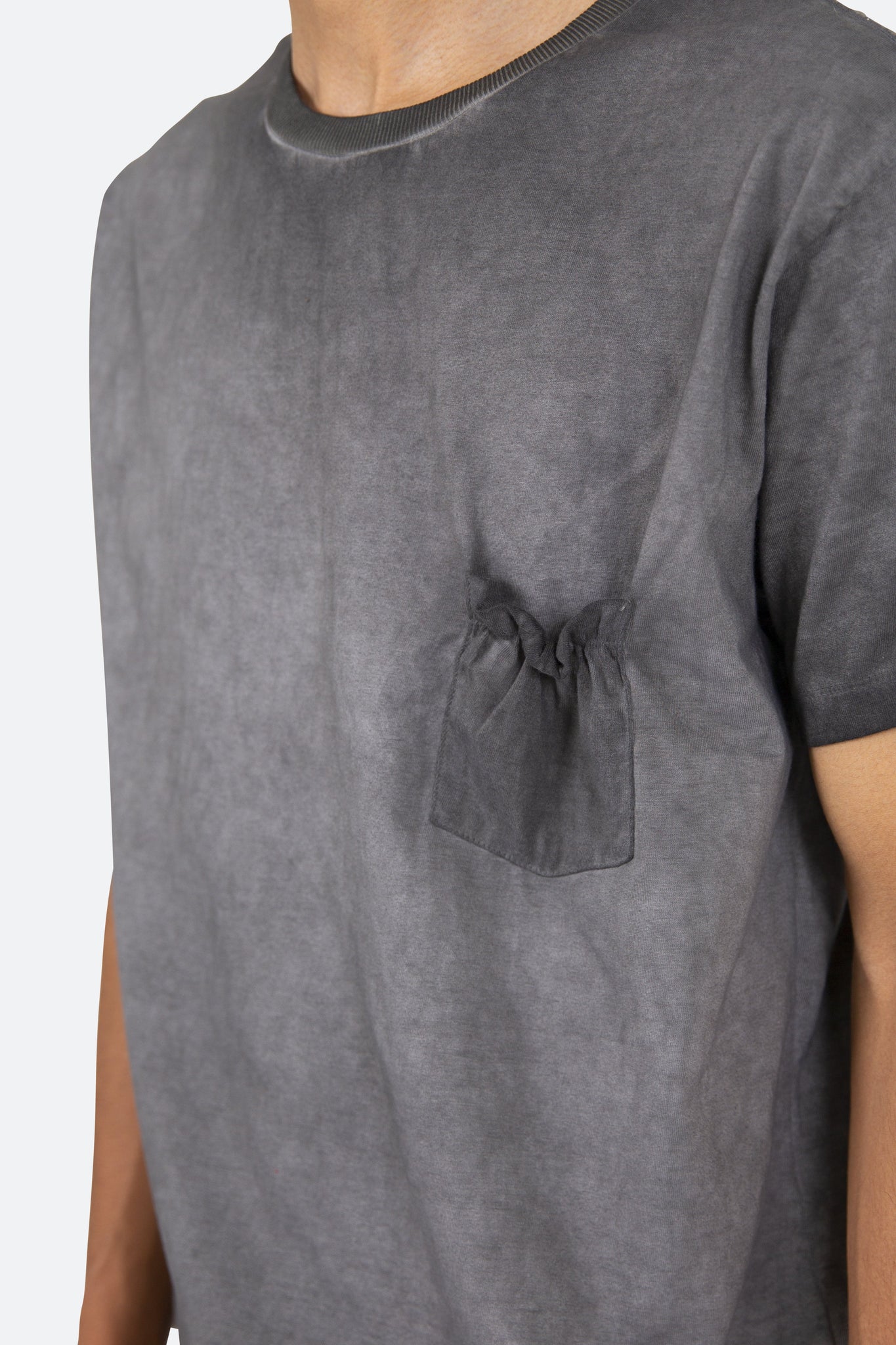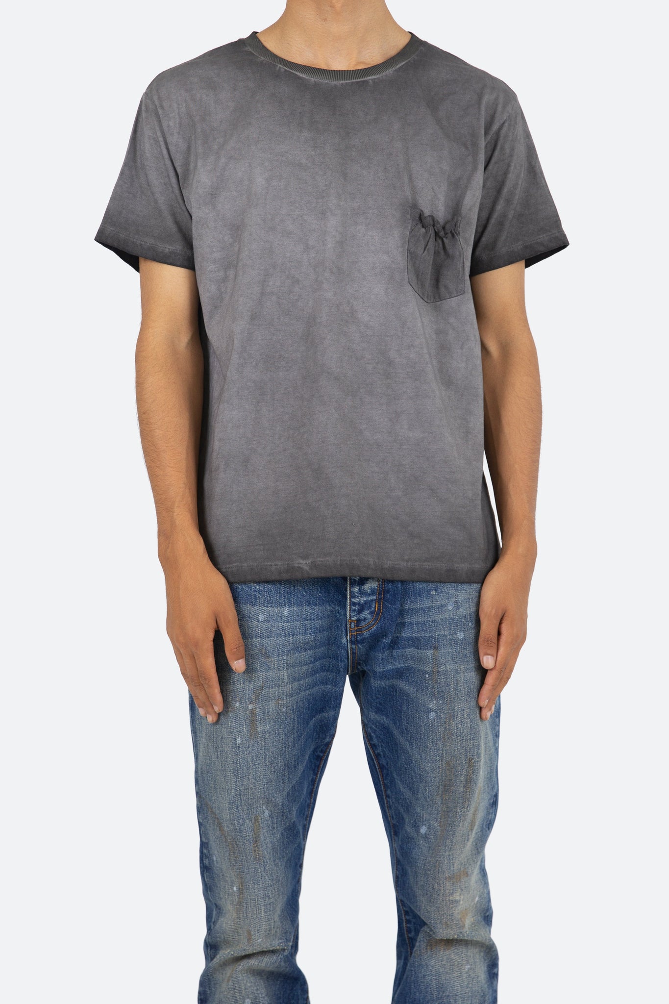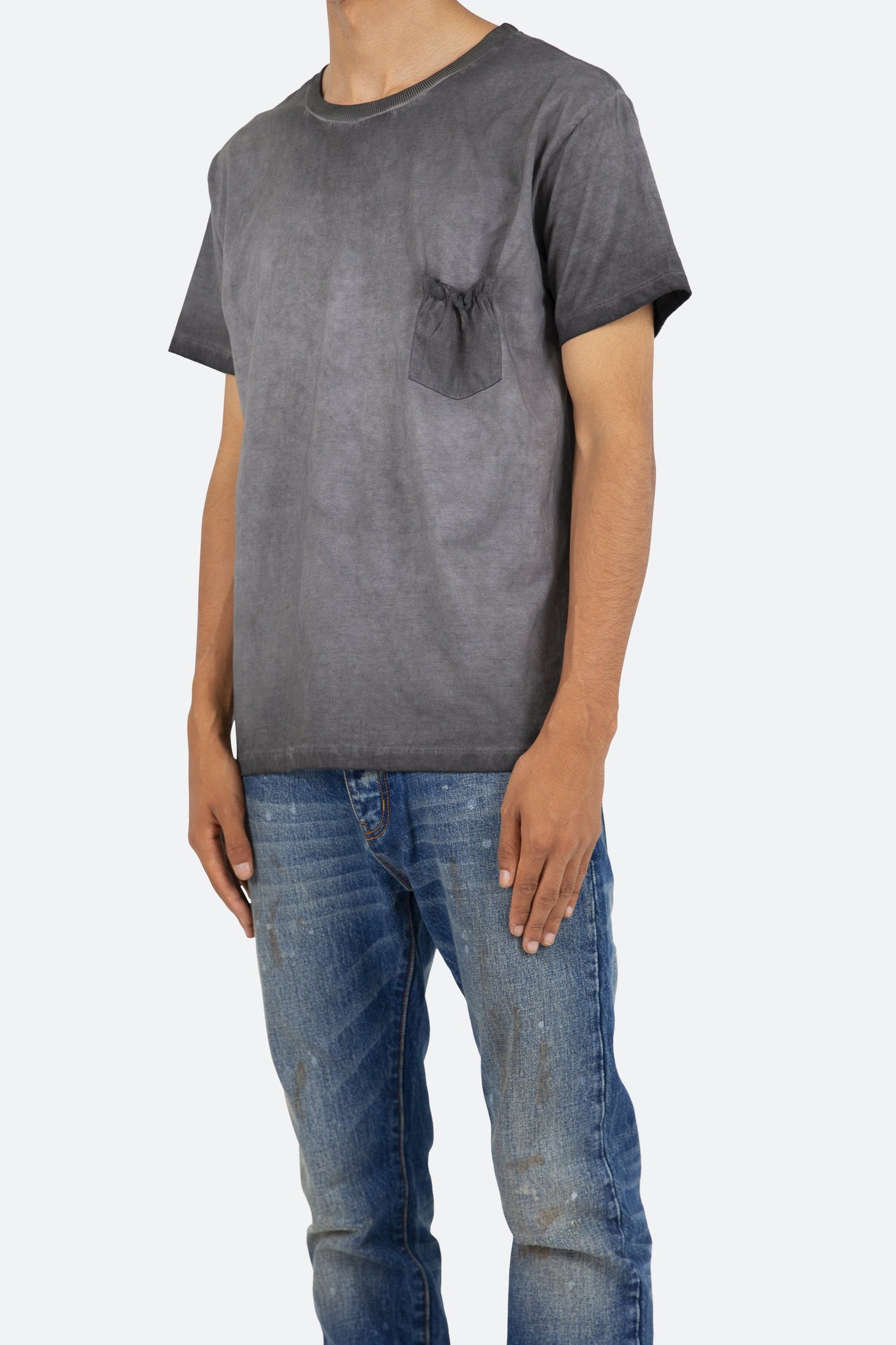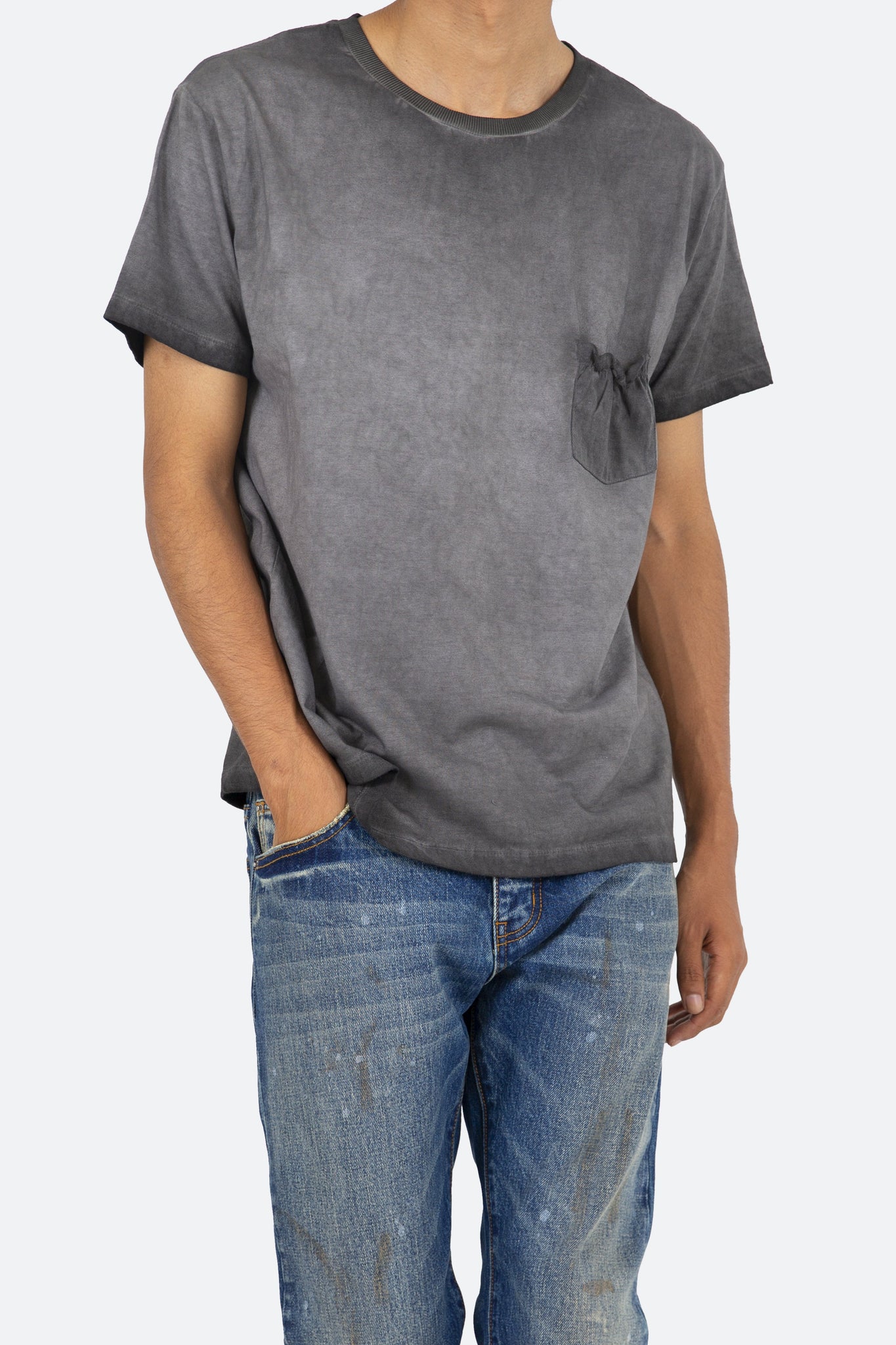 the Oil Washed Pocket Tee features an oil wash throughout, a flat hem line, and is finished with a pocket at the chest that features a cinched opening.