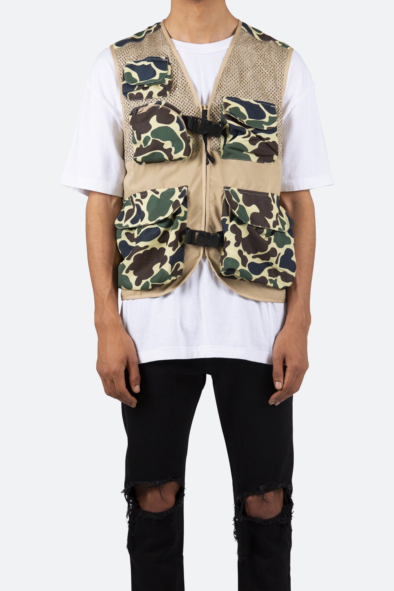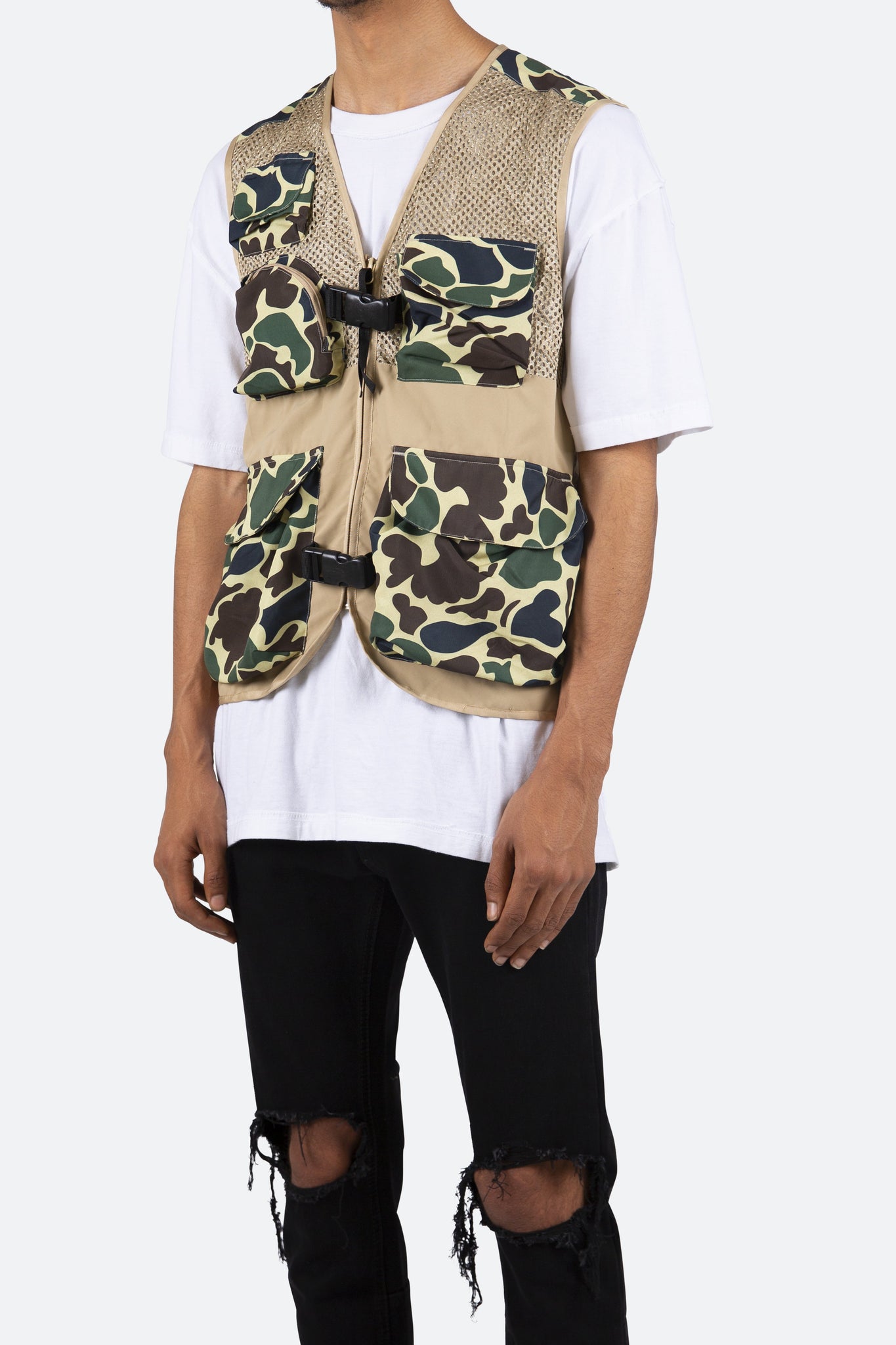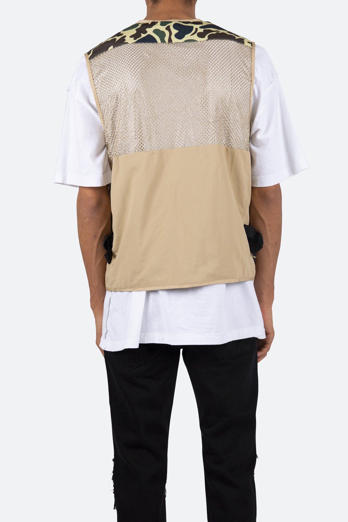 the Fishing Vest features a zipper closure, cargo-style pocket bags on the chest, snap closures at the chest, and constructed from polyester mesh and twill fabric.