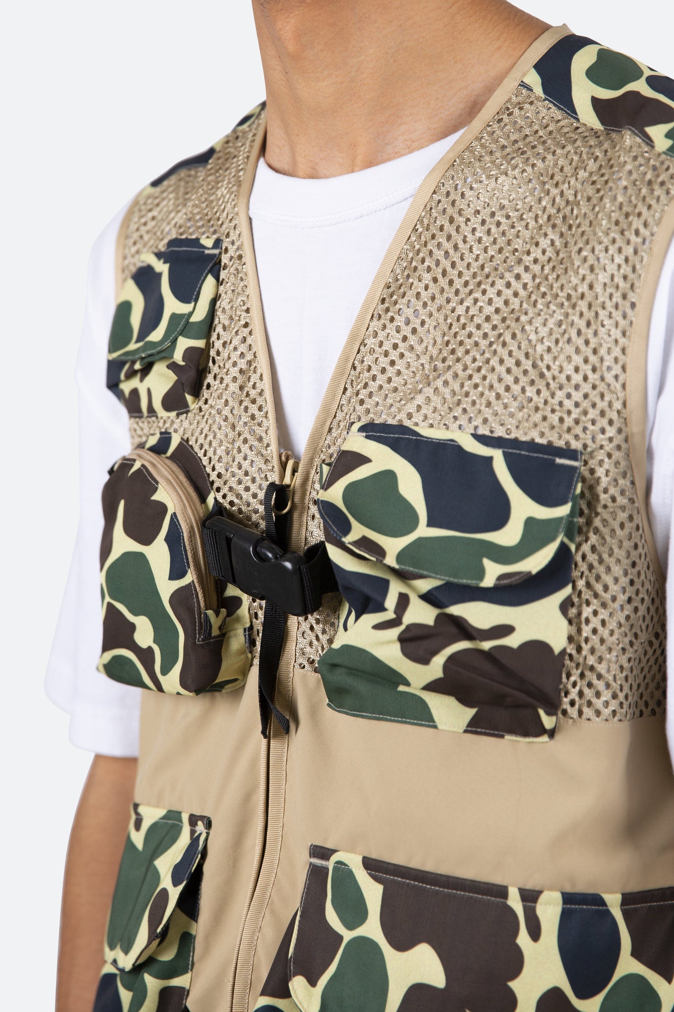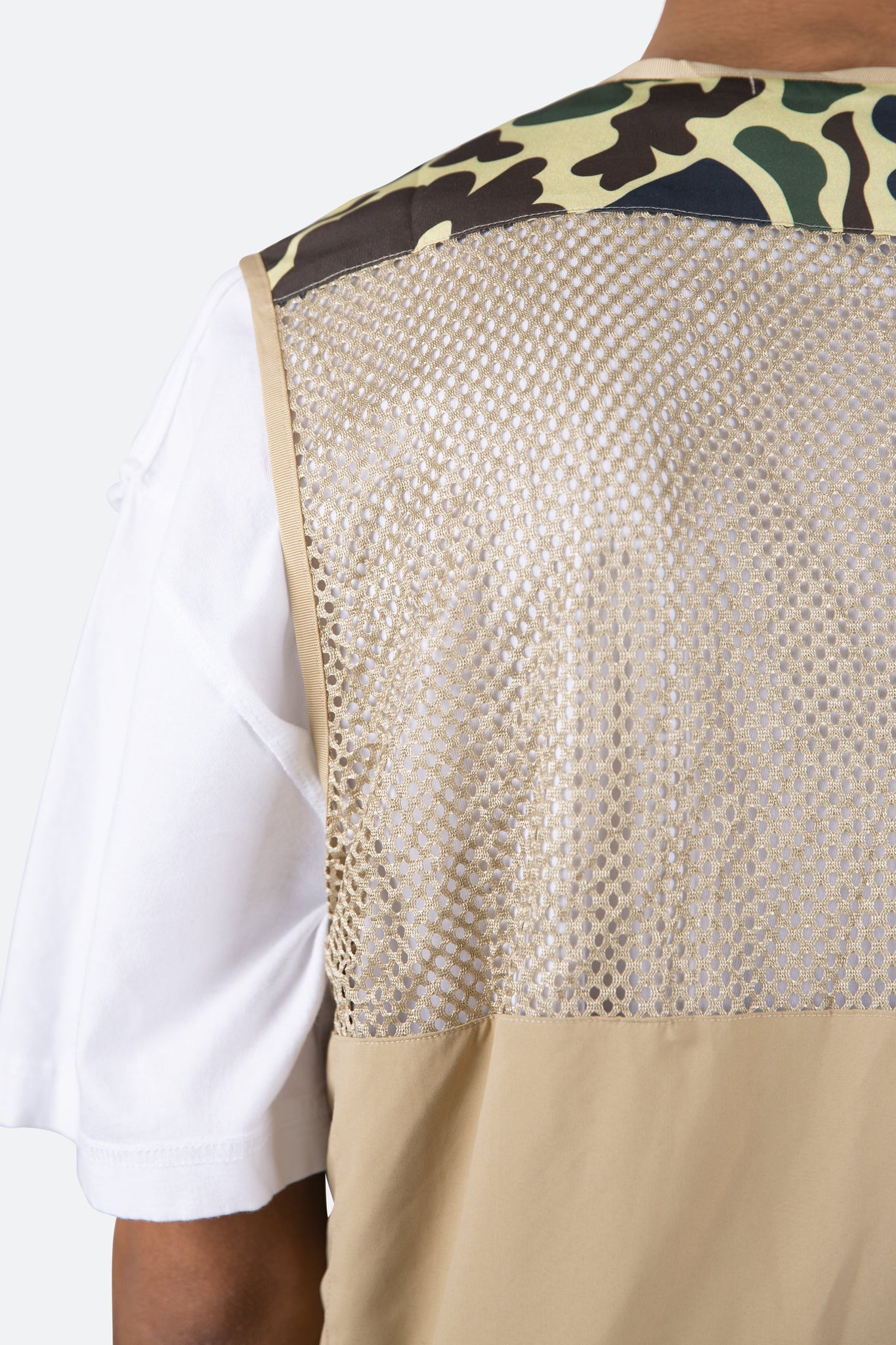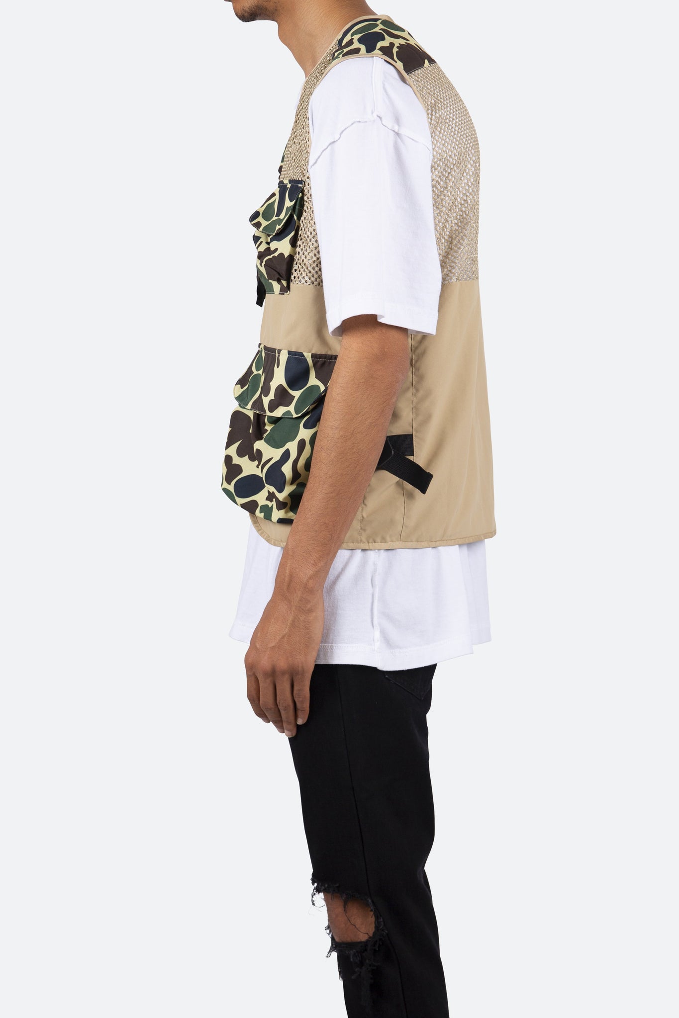 the Fishing Vest features a zipper closure, cargo-style pocket bags on the chest, snap closures at the chest, and constructed from polyester mesh and twill fabric.